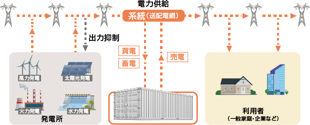 太陽光発電などで生まれた電気や、卸電力市場から購入した電気を蓄え、必要なタイミングで放電して電力系統を通じて市場に売ることができます。